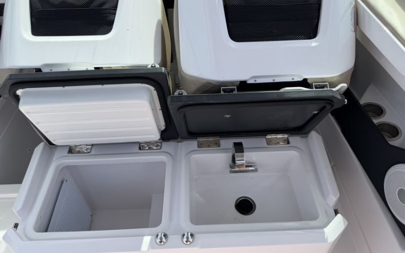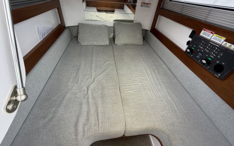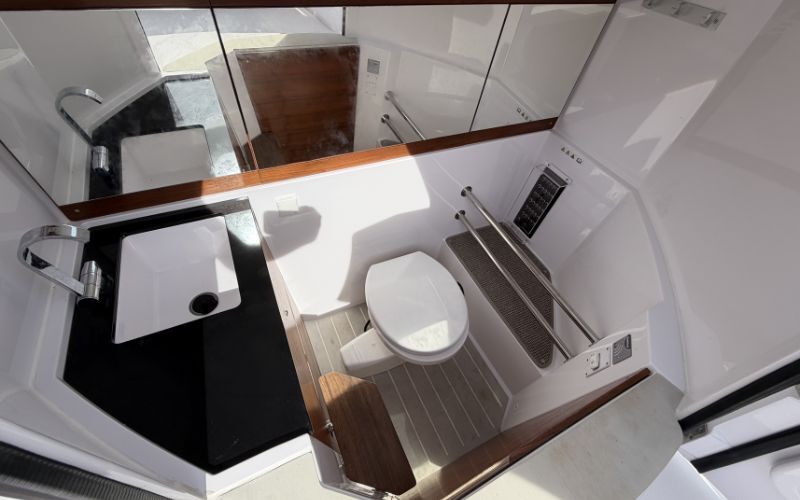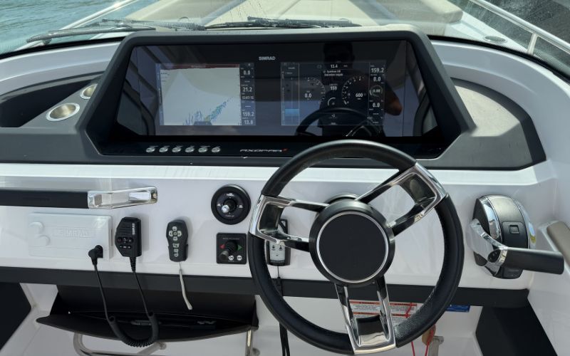 - cabin sleeps 2 - separate toilet - sundeck front/rear - bucket seat - fridge - ski mast - double ladder - rear sundeck - bow thruster - automatic trim - digital display - remote windlass - sound system - deck light - anchor lights - ttop - sun awning - fresh water tank - black water tank - deck shower